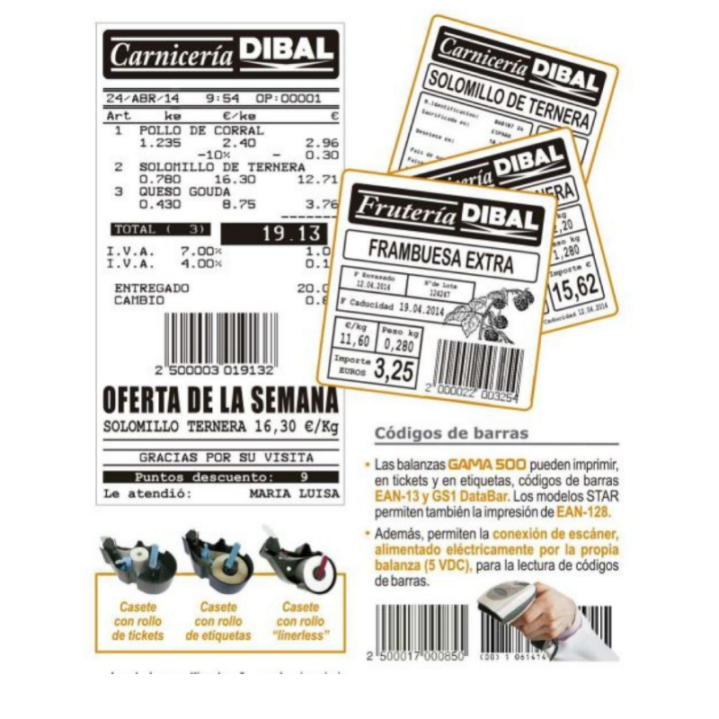 Balanza liquidadora Dibal con impresora de ticket, y/o etiquetas construida en ABS de alta resistencia, doble display LCD reto-iluminado para comprador y vendedor, 10 vendedores, hasta 5000 productos, 40 x 2 teclas directas para productos, interconexión de hasta 16 balanzas, formatos de impresión programables para ticket y etiqueta, cambio fácil de rollo, impresión de logos, código de barras EAN 13, programación y configuración por PC. Doble rango medición 30kg