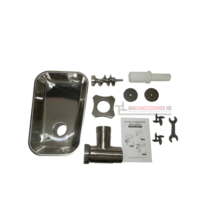 Molino para moler carne #12 Marca Machiaccesorios HG esta fabricado en acero inoxidable 304 grado alimenticio esta diseñado para pequeñas producciones, su rendimiento nominal es de 20kg/h y se debe realizar una pausa por 20 minutos para evitar recalentamiento en el motor.